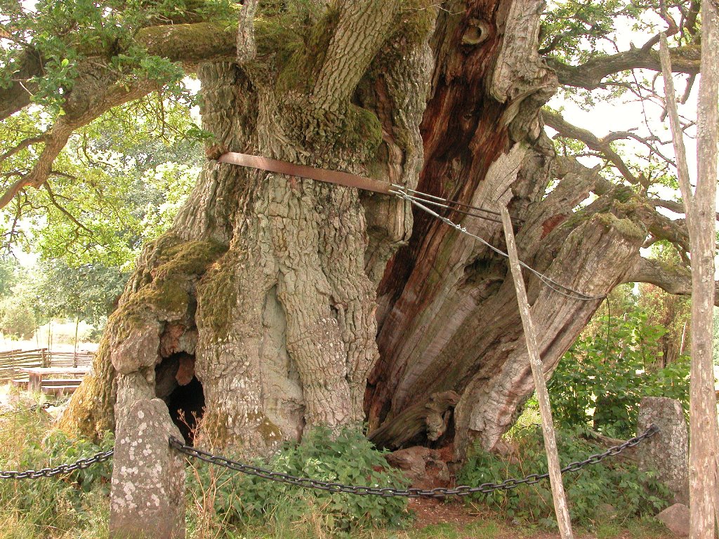 These bands are already in the process of being walled over by the oak. In fact they were removed in an attack in 2002, by a confused person that thought he was doing the tree a service, only immediately to be put back again. However, as my cicerone puts it, today it is already too late to remove the bands, since especially the lower one, with an iron wire attached to it, is what – strangling or not – holds the oak together. Without support the Kvill Oak would hardly be able to stand on its own any more, since the part of the trunk facing south would then fall out and possibly drag the rest of the tree along with itself in the fall. As long as this is not happening the oak should be able to get by for another century, especially given the fact that it looks considerably healthier today than it did after the severe drought in 1959, when it was about to give in. The hurricane Gudrun, which in January 2005 turned over hundreds of millions of trees all over north western Europe – in the southern part of Sweden alone 75 million square meters of forest, the same quantity as the total take of three years of ordinary industrial activity – didn’t affect the giant at all, even though mature oaks are somewhat vulnerable to wind.