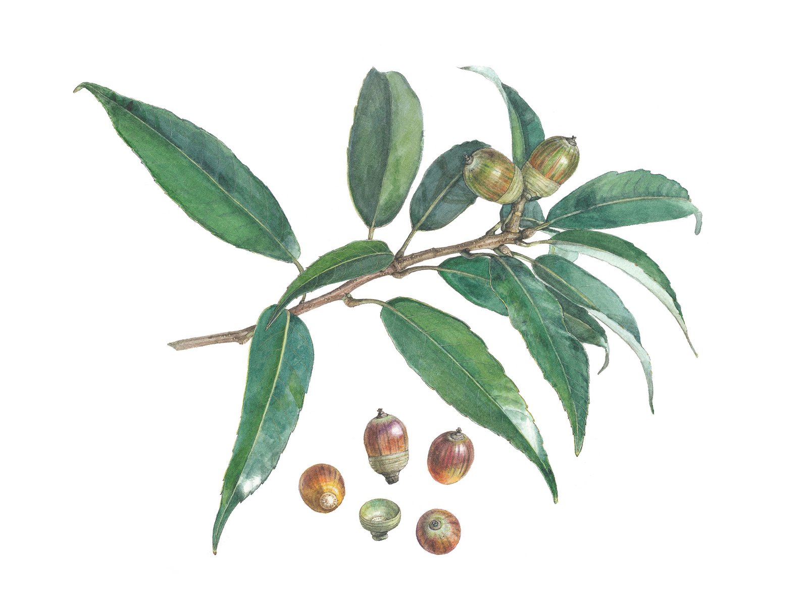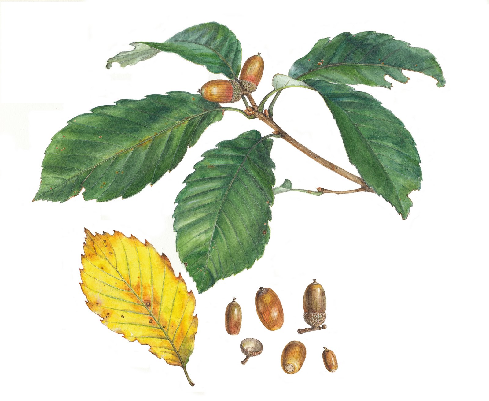 I have been drawing Fagaceae species for twenty years and in 2004 I published Pictorial Encyclopedia of Oaks in Japan. You may ask why I draw Fagaceae exclusively, but I have no specific reason for this. I just happened to start drawing them and continued the work because it was a pleasure to do so. I used to draw illustrations for children's books, but I wanted to draw real things as precisely as possible instead of drawing simple images featuring what I was asked to show. I like animals, birds, and insects, but they are hard to catch. There are beautiful flowers like roses, orchids and cherry blossoms, but they are already very popular subjects for drawings. So I decided to pick some trees, because I like big trees.